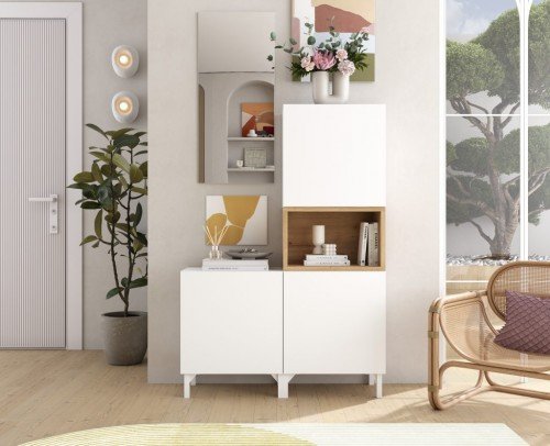 Entradita: Alto 1 puerta batiente derecha + alto 1 puerta batiente izquierda + alto 1 cajón + panel de barras + espejo.
